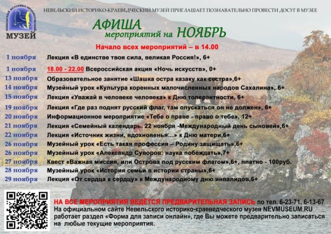 На мероприятия ведется ПРЕДВАРИТЕЛЬНАЯ ЗАПИСЬ по тел. 6-23-71, 6-13-69. Также на официальном сайте Невельского историко-краеведческого музея NEVMUSEUM.RU работает раздел "ФОРМА ДЛЯ ЗАПИСИ ОНЛАЙН", где Вы можете предварительно записаться на любые текущие мероприятия